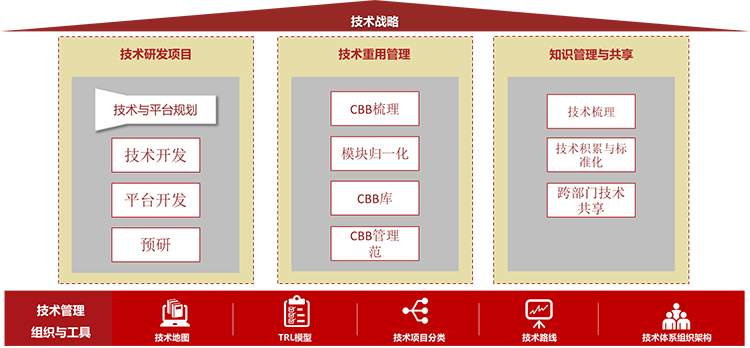 要想打破這層天花板,使研發(fā)能力提高到新的高度,就必須建立技術(shù)管理體系。中天華夏基于華為等標桿企業(yè)的優(yōu)秀實踐,以及我們服務(wù)過的眾多客戶在技術(shù)管理領(lǐng)域的探索,建立起一套完整系統(tǒng)的技術(shù)創(chuàng)新管理體系,通過內(nèi)部業(yè)務(wù)分層以及異步開發(fā)模式,以預(yù)研、技術(shù)開發(fā)、平臺/CBB等管理方法,為企業(yè)產(chǎn)品和技術(shù)創(chuàng)新提供了有力的支持。