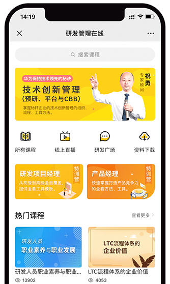 作為業(yè)界首創(chuàng)、國內(nèi)首家針對研發(fā)管理方向的專業(yè)學(xué)習(xí)平臺,研發(fā)管理在線面向研發(fā)型企業(yè),為企業(yè)中高層領(lǐng)導(dǎo)者及研發(fā)核心職能崗位(如產(chǎn)品經(jīng)理、項目經(jīng)理、系統(tǒng)工程師以及研發(fā)職能經(jīng)理等研發(fā)關(guān)鍵人才),打造完整的課程體系。
