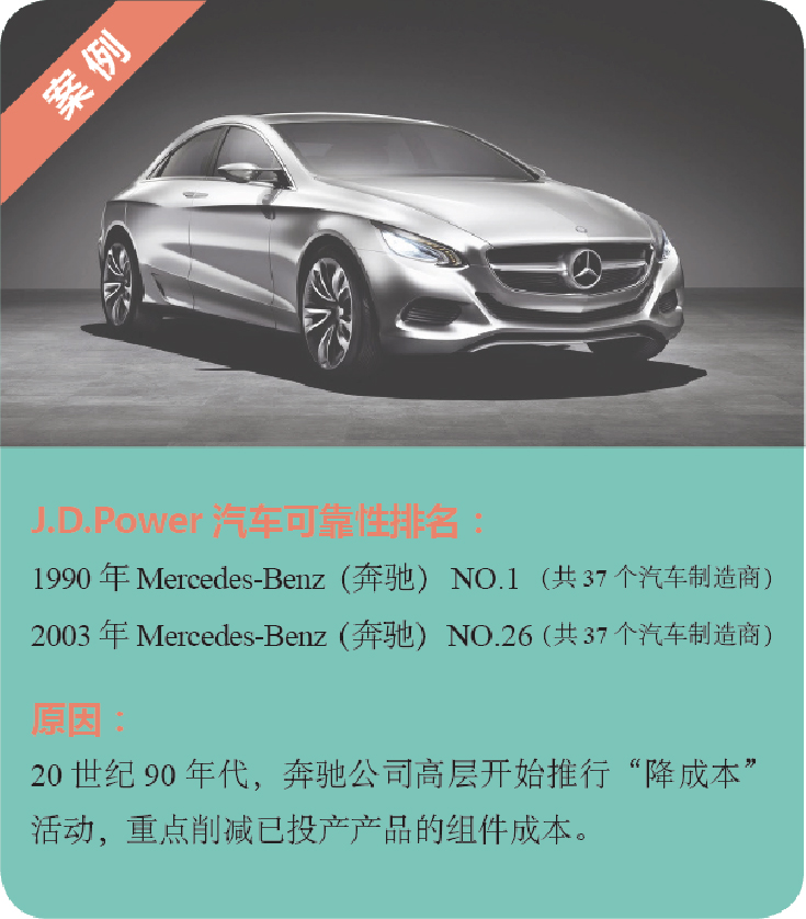 例如:以低廉物料替換現(xiàn)有物料,極易引發(fā)后續(xù)的質(zhì)量問題,造成維護成本上升。以奔馳公司為例:依據(jù)權(quán)威第三方市場研究機構(gòu)J.D.Power統(tǒng)計,在1990年~2003年的13年間,奔馳公司的可靠性排名從第1名下滑到第26名(共計37家汽車制造商),其根本原因就是奔馳公司內(nèi)部盲目的降物料成本活動。